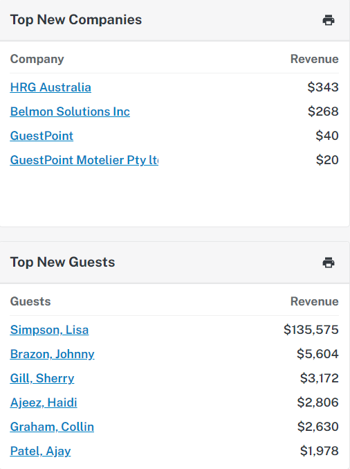 The ‘Top New Companies’ and ‘Top New Guests’ only show customers that became customers in the period selected. Again, you can see all new customers for the period by clicking the ‘Print’ icon.