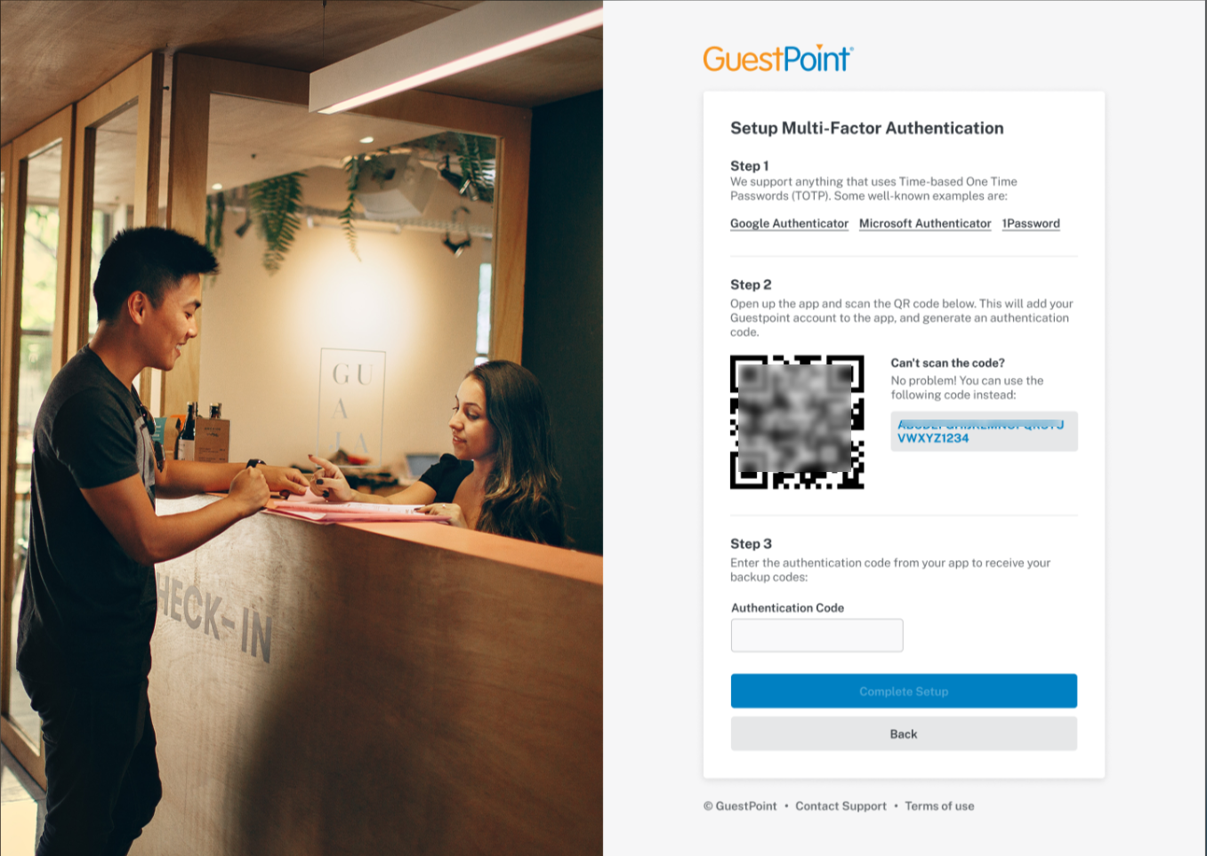 How it works: You scan a QR code provided by GuestPoint using your app. The app generates a 6-digit code that changes every 30 seconds.