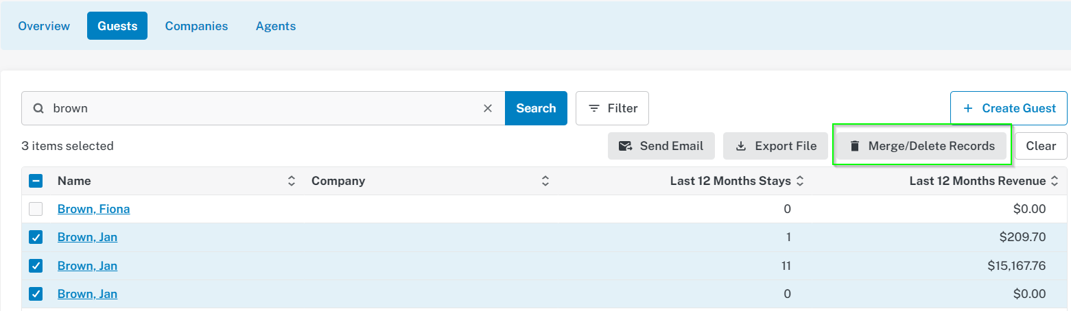 option of selecting the record to keep and the one/s to merge. If there have been no reservations attached to some of the records you will be able to delete these records completely.