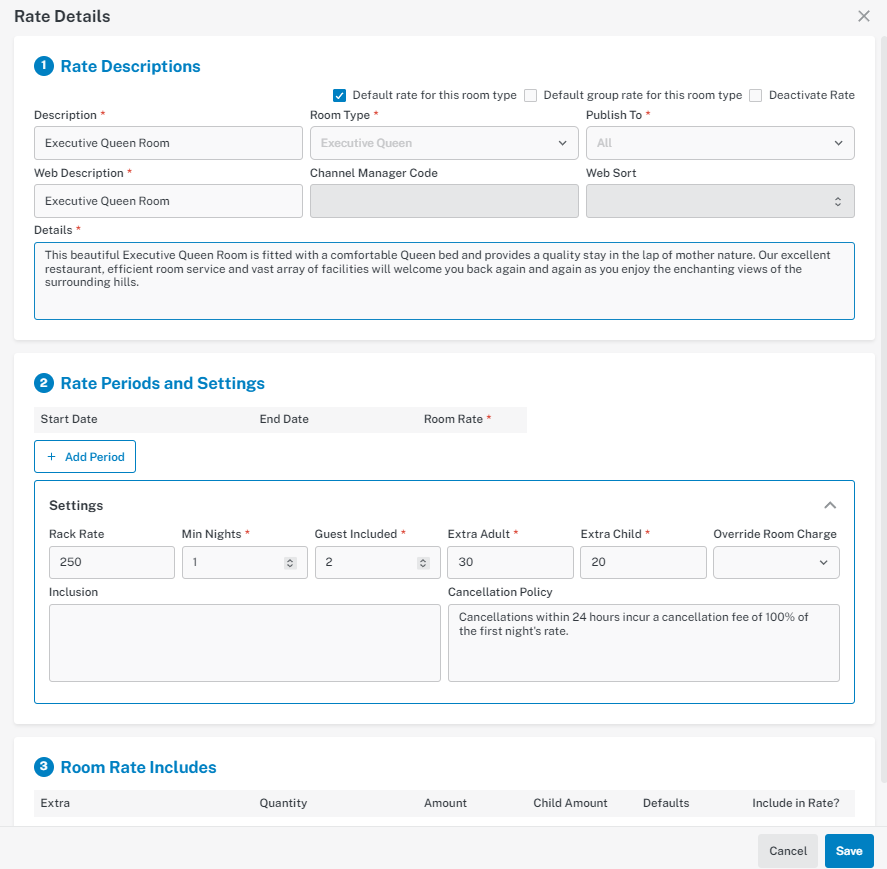 Inclusions: If the rate includes any additional benefits (e.g. complimentary breakfast), you can describe these here. This text is included in the confirmation email and displays on your WebPoint page. If you are linked to a compatible Channel Manager, the inclusions text will also be sent there.
